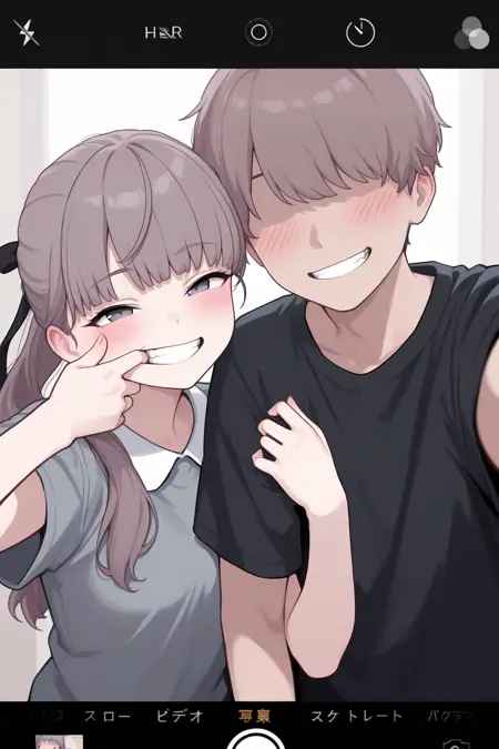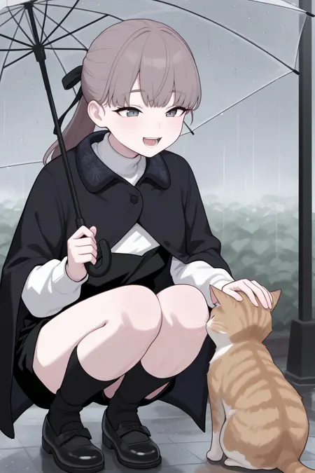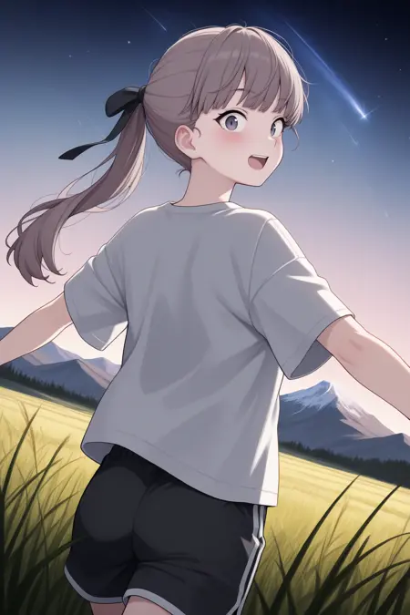 • 외모: vcl, 회색 눈, 갈색 머리, 둔한 앞머리, 긴 머리, 포니테일, 머리 리본, 검은 리본