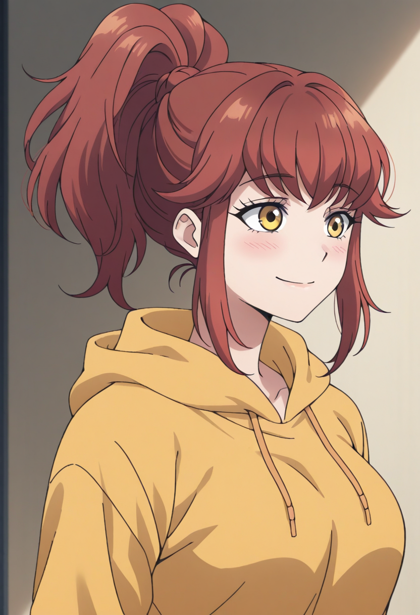 Trigger = zzmisakijingujizz, Tags = ponytail, 1girl, solo, brown hair, yellow eyes, blush, breasts, brown eyes, smile, bangs, shirt, , sidelocks, red hair, hoodie