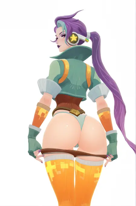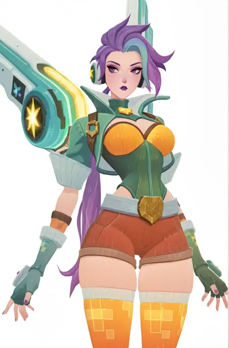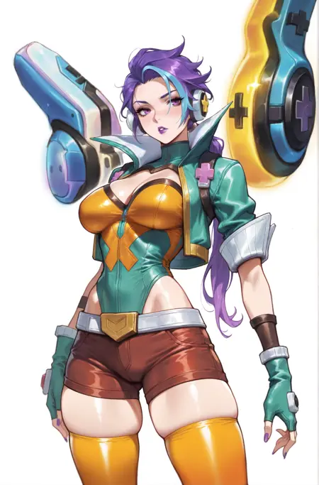 Arcade Kaisa ,purple hair, one blue strand, long hair, ponytail, purple eyes, purple lips, headphones, green-orange top, light green jacket , high collar jacket , brown shorts, orange thigh-highs, fingerless gloves,