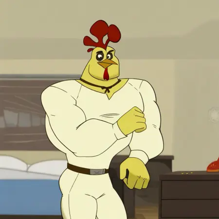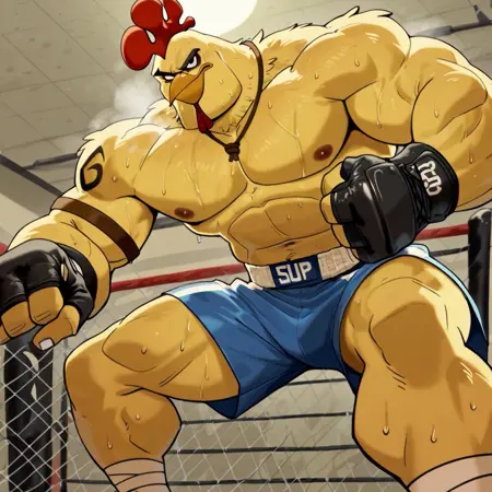 | 학습된 단어 | Porfirio, solo, furry male, fingerless gloves, tattoo, muscular male, black eyes, yellow skin, bird, chicken, anthro, pectorals, red chicken comb, mohawk, red wattle, abs, talons, chicken legs, black arm band tattoo, brown neck ribbon, blue shorts, bandaged ankles, thick eyebrows, white tank top, white long sleeved shirt, redish brown pants, bara, beak, 복사됨! |