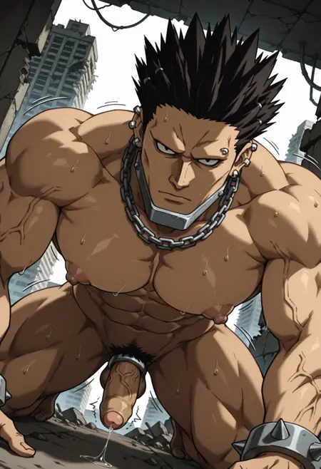 black eyes, sanpaku, Spiked Hair, Iron Jaw, Iron Chin, No eyebrows, eyebrow piercing, industrial piercing,