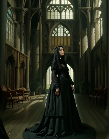 RO2,低角度,身穿长黑袍的女性,破碎的家具,中世纪,室内,