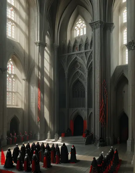 R03,史诗规模,史诗细节,身着黑色与红色长袍的小型集会群体在庄严仪式中排列,中世纪,室内,神秘中世纪仪式,