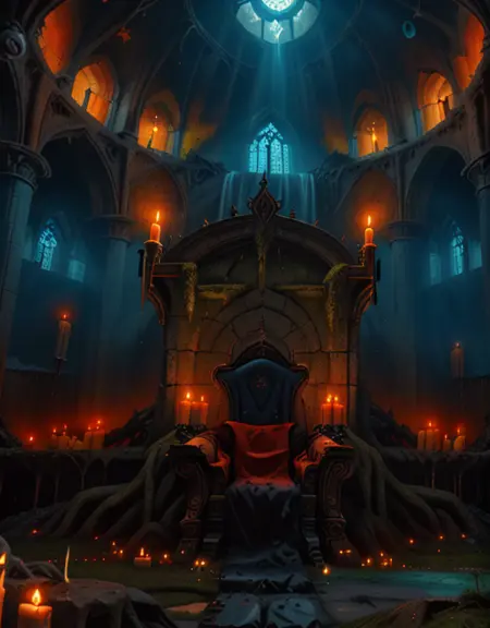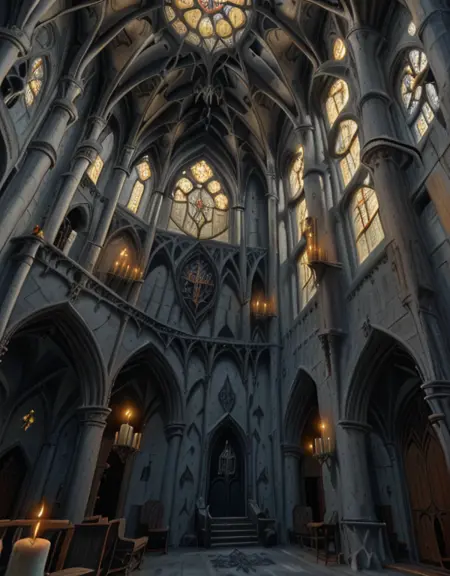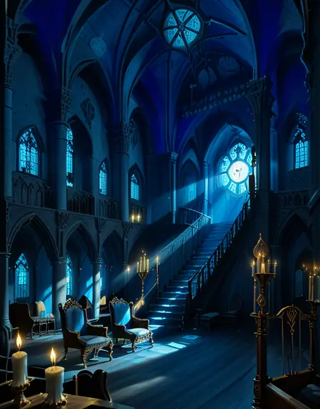 MUR0, very dark, pitch dark, medieval, candles, high ceiling, moon light, moon shades, gold, silver, room, rosace stained glass, arches, medieval furniture, blue, medieval detailed architecture, detailed wall carvings, detailed arches carvings,