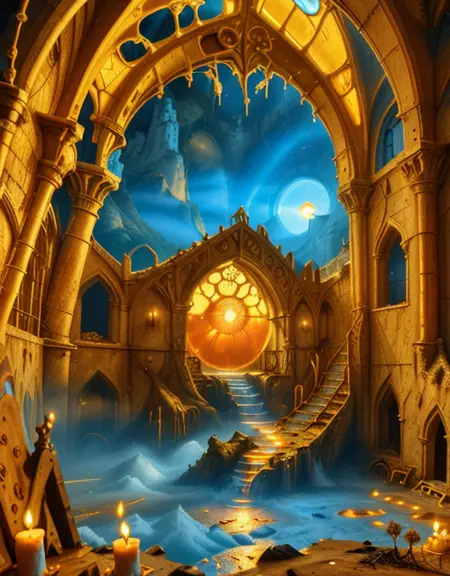 MUR0, 매우 어두움, 완전한 어둠, 중세, 초롱불, 높은 천장, 달빛, 달빛 그림자, 금, 은, 방, 로자스 유리창, 아치, 중세 가구, 파랑, 상세한 중세 건축, 상세한 벽 조각, 상세한 아치 조각