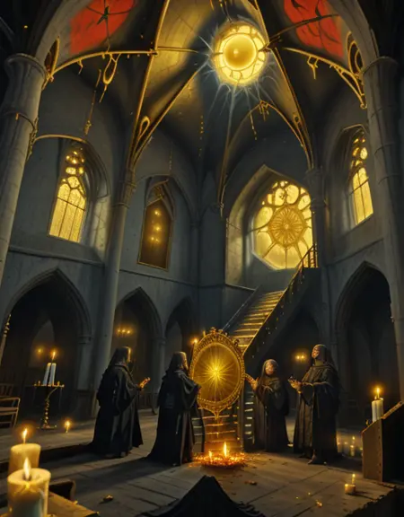 R03, 웅장한 스케일, 웅장한 디테일, 엄숙한 의식 자세로 모인 작은 검은 및 빨간 로브 차림의 신도들, 중세, 실내, 마법적 중세 의식