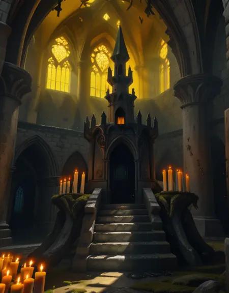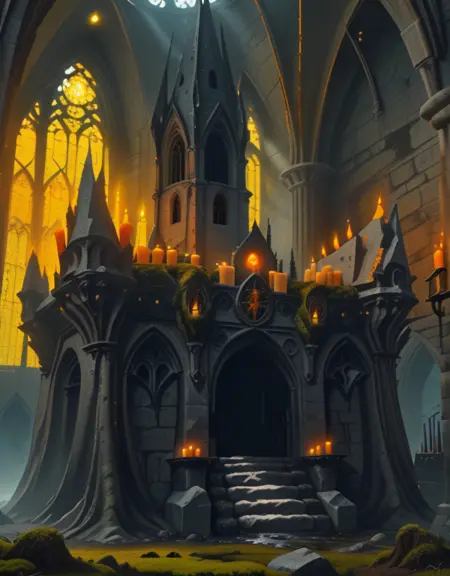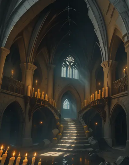 MUR0, 매우 어두움, 완전한 어둠, 중세, 촛불, 높은 천장, 달빛, 달의 그늘, 금, 은, 방, 로제트 유리창, 아치, 중세 가구, 파랑, 상세한 중세 건축, 벽 조각, 아치 조각