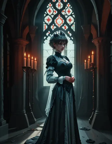 R03, 서사적인 스케일, 서사적인 디테일, 엄숙한 의식 자세를 취한 작은 검은 및 붉은 로브를 입은 신도들, 중세, 실내, 음험한 중세 의식