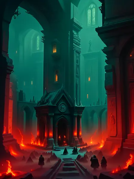 R03,史诗规模,史诗细节,身着黑色与红色长袍的小型集会群体在庄严仪式中排列,中世纪,室内,神秘中世纪仪式,
