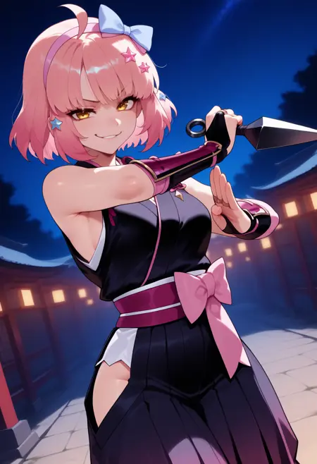 St. Theresa's Girls Academy School Uniform: ch1erudef, short hair, pink hair, ahoge, star hair ornament, bow hairband, blue bow, pink hairband, yellow eyes, star in eye, black coat, hooded coat, hood down, open coat, short sleeves, white shirt, collared shirt, pink bowtie, red skirt, plaid skirt, pleated skirt, frilled skirt, blue thighhighs, single thighhigh, pink socks, single sock, bracelet