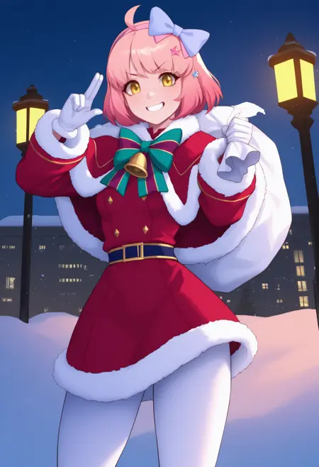 성 테레사 여자 학교 교복: ch1erudef, 단발, 분홍색 머리, 아호게, 별 머리 장식, 리본 헤어밴드, 파란색 리본, 분홍색 헤어밴드, 노란색 눈, 눈에 별, 검은 코트, 후드 코트, 후드 내려짐, 벌어진 코트, 짧은 소매, 흰색 셔츠, 칼라 셔츠, 분홍색 넥타이, 빨간 스커트, 체크 무늬 스커트, 접힌 스커트, 프릴 스커트, 파란색 허벅지 긴 양말, 한쪽 허벅지 긴 양말, 분홍색 양말, 한쪽 양말, 팔찌
