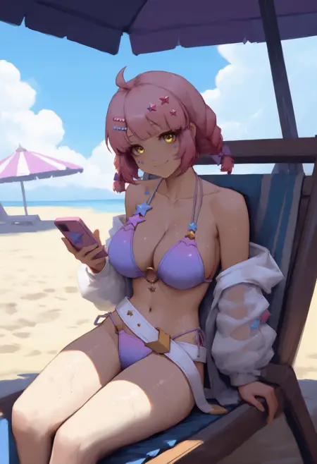 비키니: ch1erubikini, 단발, 분홍색 머리, 아호게, 더블 브레이드, 별 머리 장식, 머리클립, 헤어 리본, 보라색 리본, 노란색 눈, 눈에 별, 흰색 재킷, 투명 재킷, 벌어진 재킷, 어깨 드러냄, 긴 소매, 보라색 비키니, O링 비키니, 사이드 티 언더웨어, 느슨한 벨트, 흰색 벨트, 드러난 어깨, 종아리뼈, 배꼽, 가슴 선, 큰 가슴
