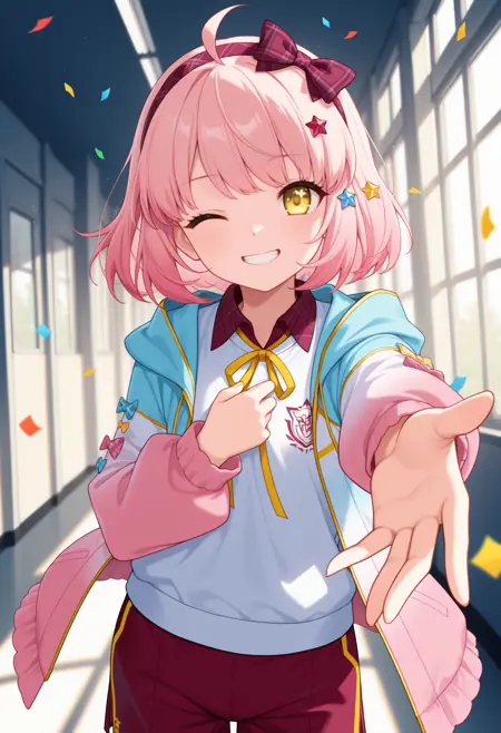 학교 축제: ch1erufest, 단발, 분홍색 머리, 아호게, 별 머리 장식, 리본 헤어밴드, 빨간 리본, 체크 무늬 리본, 빨간 헤어밴드, 노란색 눈, 눈에 별, 다색 재킷, 파란 재킷, 분홍 재킷, 후드 재킷, 후드 내려짐, 벌어진 재킷, 긴 소매, 체육복 상의, 흰색 셔츠, 칼라 셔츠, 목 리본, 노란 리본, 빨간 반바지, 체육 반바지