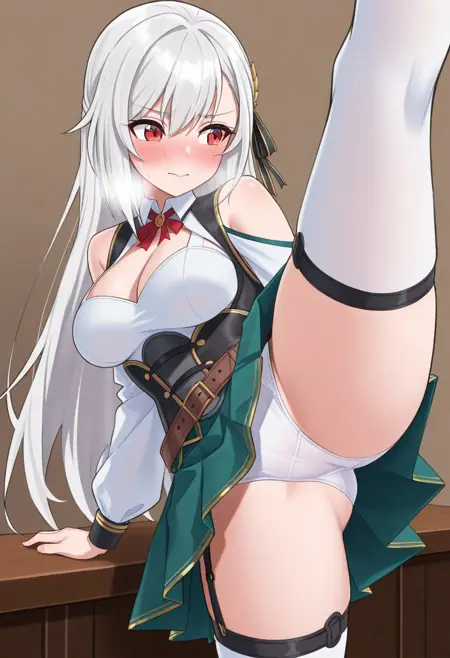 1girl, solo, IngEu, white hair, long hair, red eyes, hair ornament, boob window, red ribbons, no cape, gold chain, framed breasts, white shirt, shoulder cutouts, bare shoulders, black corset with gold trim, green skirt with gold trim, pleated skirt, garterbelt, brown leather belt, white thighhighs with black trim, black wrist cuffs with gold trim