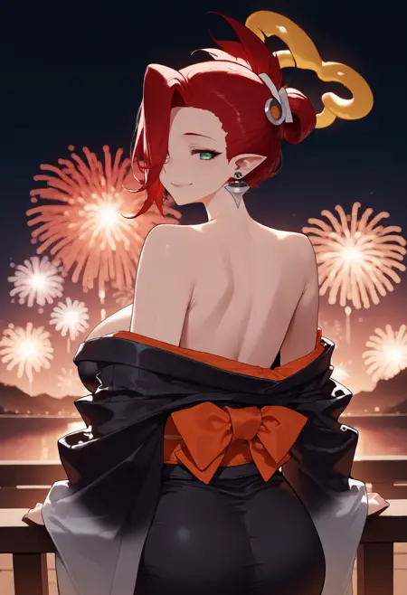 Bertha: long hair, red hair, hair over one eye, pointy ears, halo, green eyes, short dress, black dress, pencil dress, white shirt, cleavage cutout, long sleeves, black gloves, fingerless gloves, mechanical wings, white thighhighs, earrings, red nails, large breasts