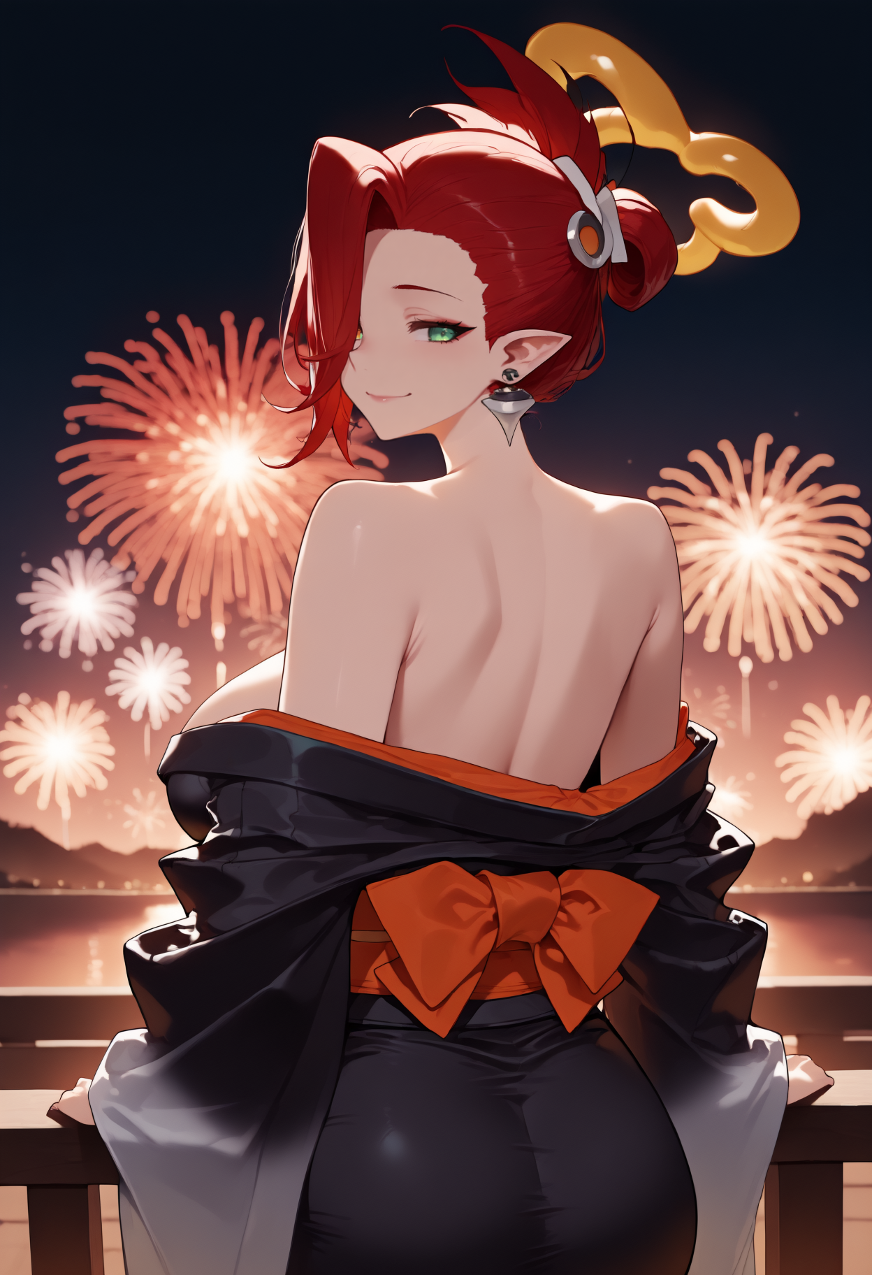 伯莎: 长发,红发,头发遮住一只眼睛,尖耳朵,光晕,绿眼,短裙,黑色裙子,铅笔裙,白衬衫,露胸切口,长袖,黑手套,露指手套,机械翅膀,白色过膝袜,耳环,红指甲,大乳房