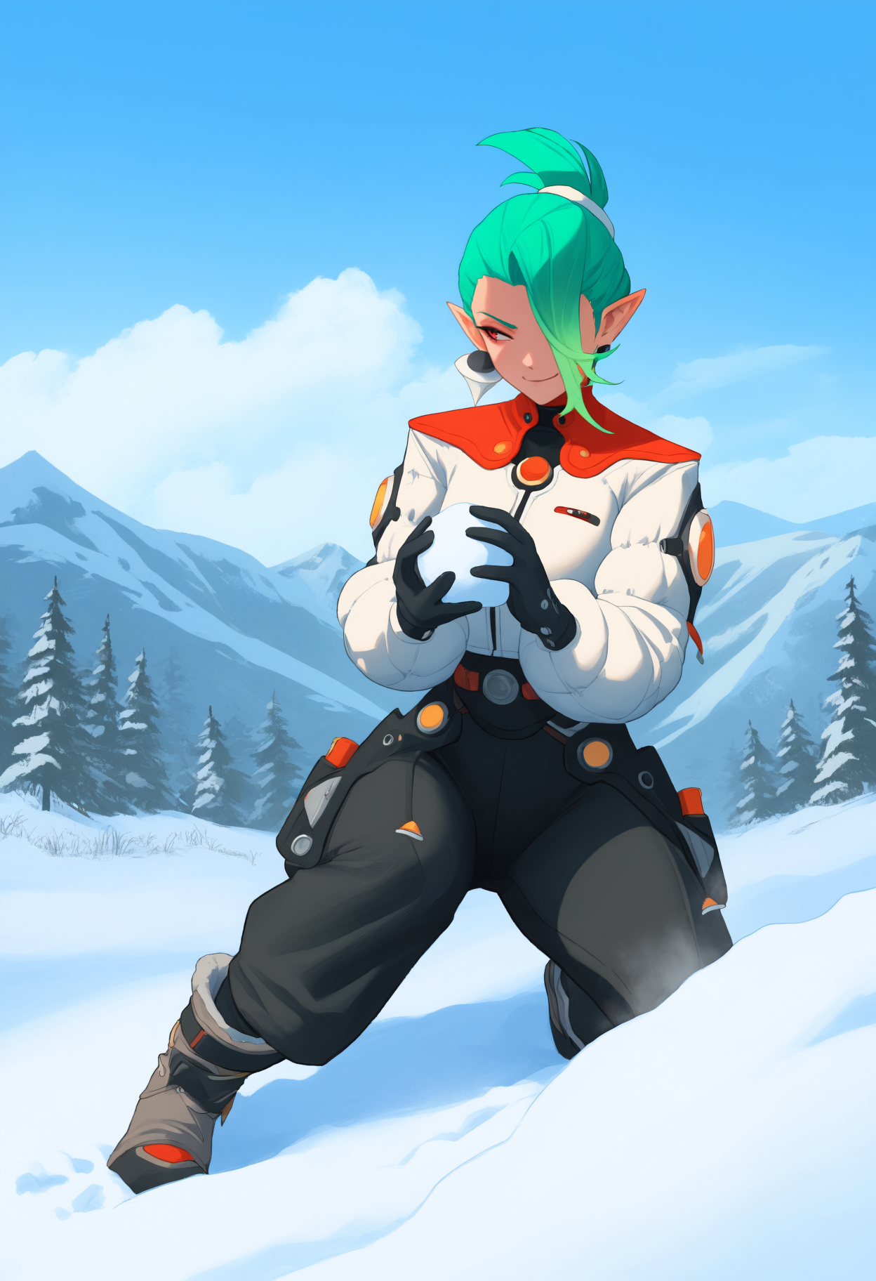 莉拉: 长发,绿发,头发遮住一只眼睛,尖耳朵,光晕,红眼,短裙,黑色裙子,铅笔裙,白衬衫,露胸切口,长袖,黑手套,露指手套,机械翅膀,白色过膝袜,耳环,绿指甲,大乳房