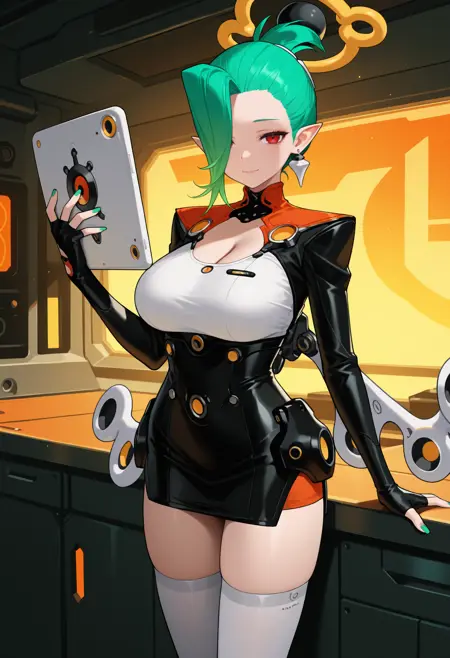 Lyla: long hair, green hair, hair over one eye, pointy ears, halo, red eyes, short dress, black dress, pencil dress, white shirt, cleavage cutout, long sleeves, black gloves, fingerless gloves, mechanical wings, white thighhighs, earrings, green nails, large breasts