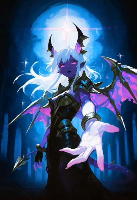 Lilith, 1girl, white hair, sidelocks, long hair, purple eyes, glowing eyes, horns, colored skin, purple skin, black lips, breasts, shoulder armor, tail, wings