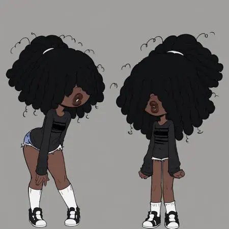 | 학습된 단어 | (dark skin,afro hair,black hair,short hair,hair over eyes:1)(ponytail hairstyle)(thick lips:1) (petite,shortstack)(small breasts,thin arms,thin arms,small waist,short legs) (huge hips,wide hips,huge thighs,thick thighs,huge butt) (black sweater,long sleeves,denim shorts,white socks,shoes)복사됨! |