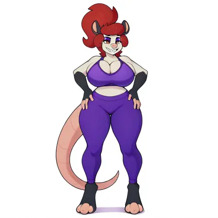 Possum, American opossum, white fur, red hair, ponytail, amber eyes, pink nose, black ears, black hands, pink fingers, black feet, pink toes, Possum tail, large breasts, purple eyeshadow,