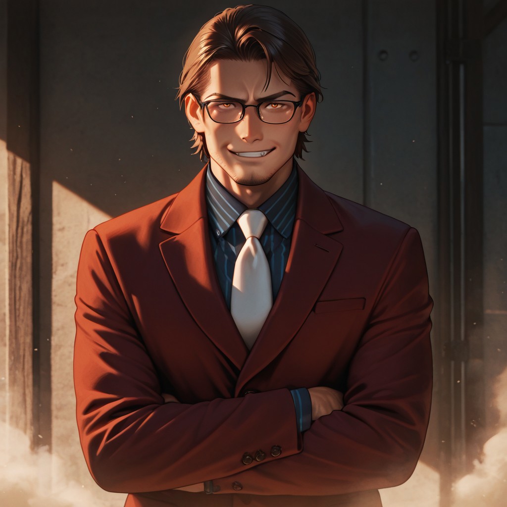 red blazer, blue collared shirt, pinstripe pattern, white tie, belt, brown pants, black leather shoes