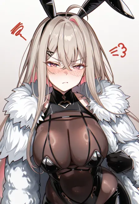 dark lancelot, short hair, white hair, yellow eyes, pale skin, rabbit ears, fake animal ears, highleg leotard, brown bodyshuit, black gloves, fur coat, thigh boots