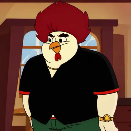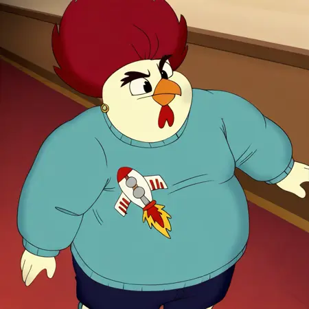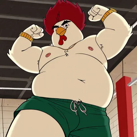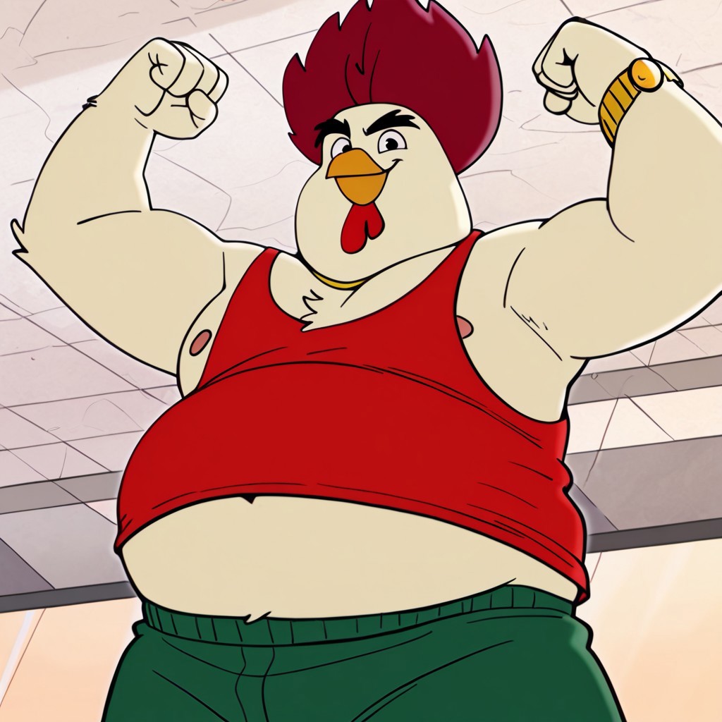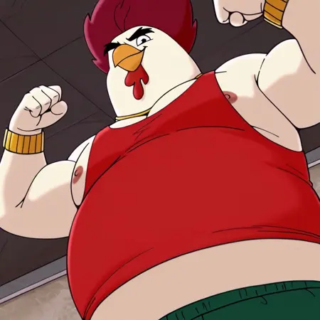 | 학습된 단어 | Emiliano, solo, 1boy, fat, furry male, red hair, thick eyebrows, beak, black eyes, chicken, gold necklace, gold watch, red wattle, gold earring, red tank top, green shorts, green shoes, black collared shirt with red sleeve trim, gold bracelet, blue slippers, long sleeved light blue sweater, dark blue shorts, 복사됨! |