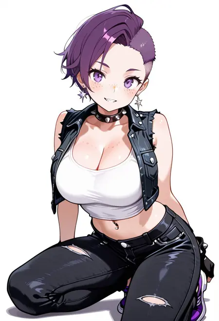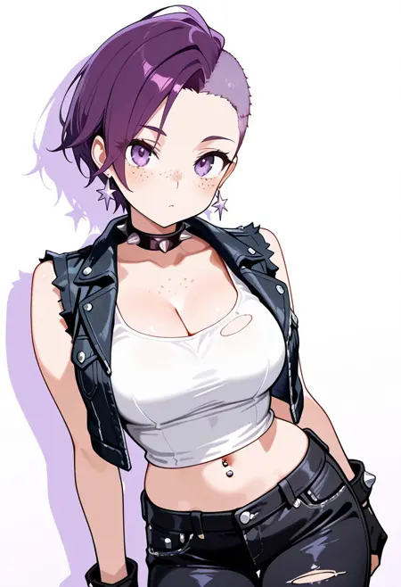 MMC, purple hair, shaved head, star-shaped earrings, freckles on upper chest and cheeks, sharp purple eyes, choker with spikes, white tight tank top, black denim vest with metal studs, black ripped skinny jeans, black denim fabric, navel piercing