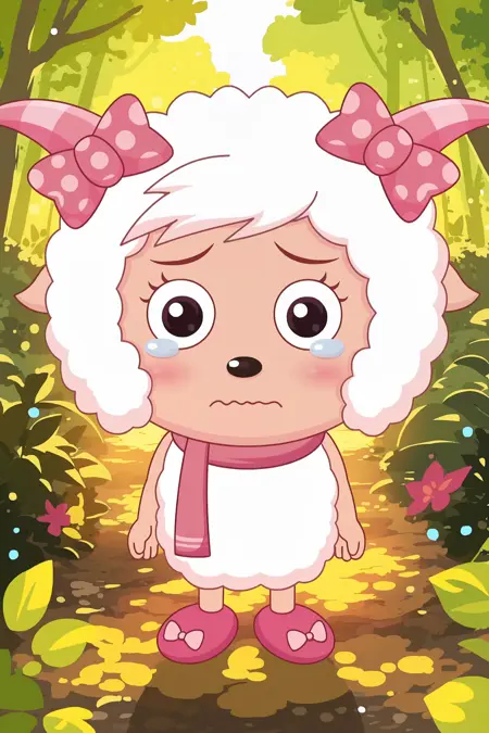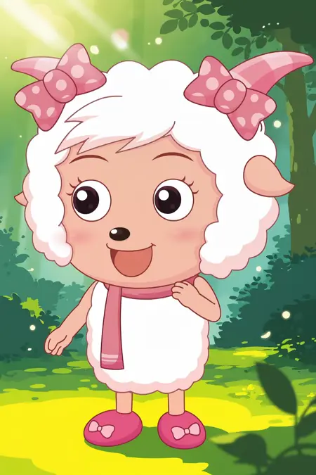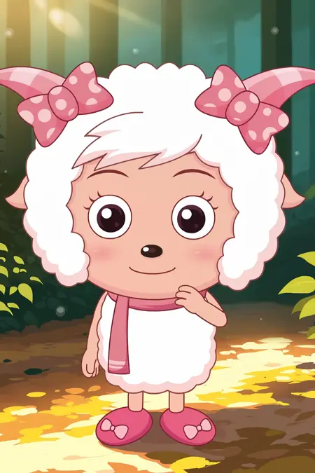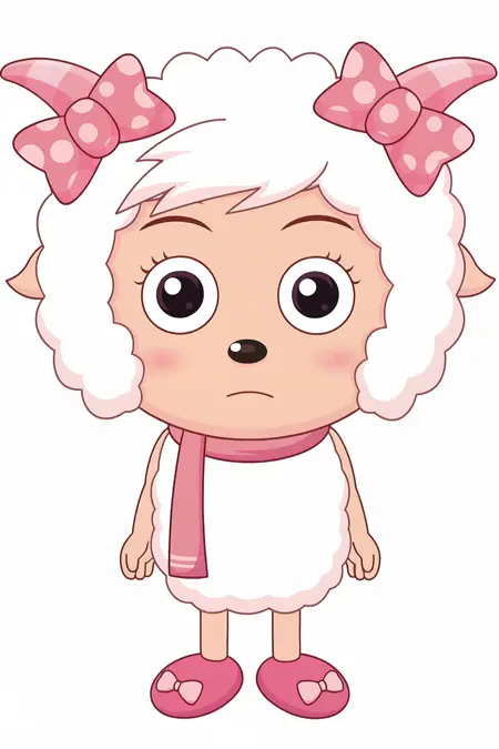 プロンプト:tibbie, 1girl, furry female, four fingers, sheep girl, big head, pink eyes, white hair, pink white horns, sheep horns, sheep ears, animal nose, pink bow, polka dot bow, pink scarf, pink footwear,