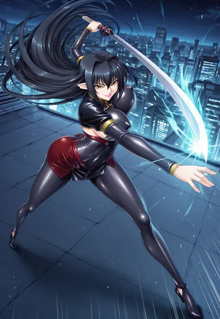 1番目の衣装:ラテックス衣装、ラテックスボディスーツ、ぴったりフィット、タートルネック、突起した乳首をカバー、サイドボブ、長袖、ショートドレス、サイドスリット、不可能な衣装、黒いパンスト、ハイヒール、太ももが太い、黒いヒール、ツヤツヤの肌、ツヤツヤの衣装