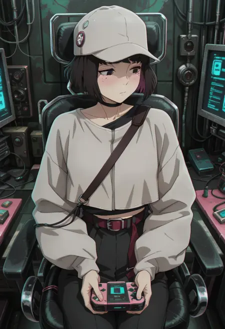 야구 모자, 양말, 전신, 단순한 배경, Eleina, 긴 소매, 단발, 왼쪽 눈 아래 두더지, 애니메이션 컬러링