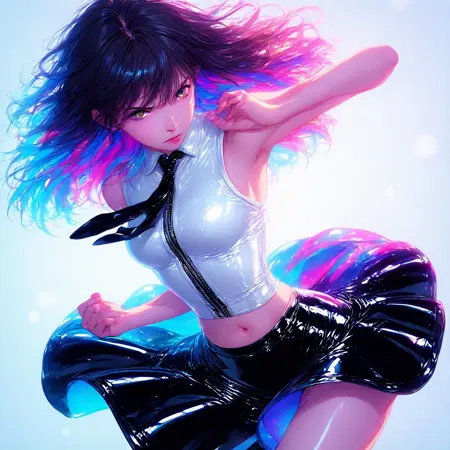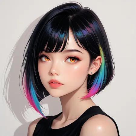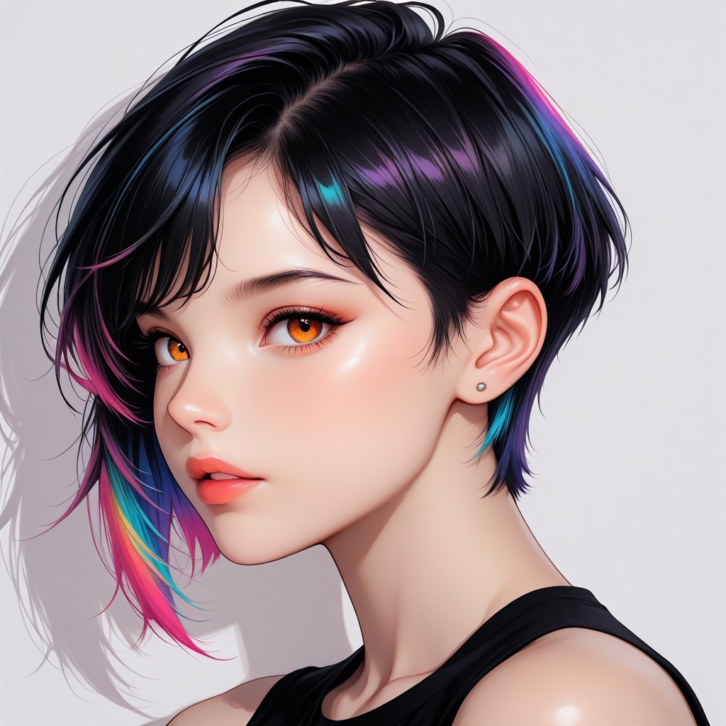 (米库,(不对称精灵短发,深色头发搭配霓虹粉挑染),(完美自然的嘴唇,光泽唇,圆润可爱的面部,性感表情))