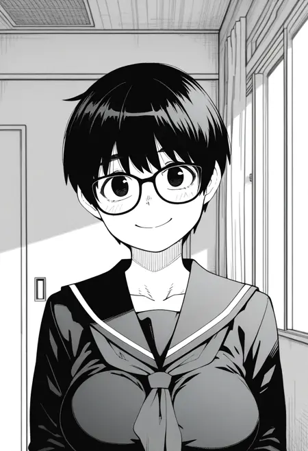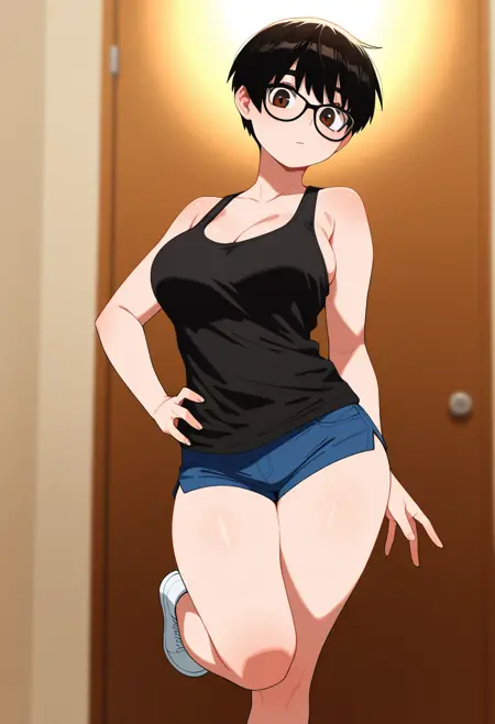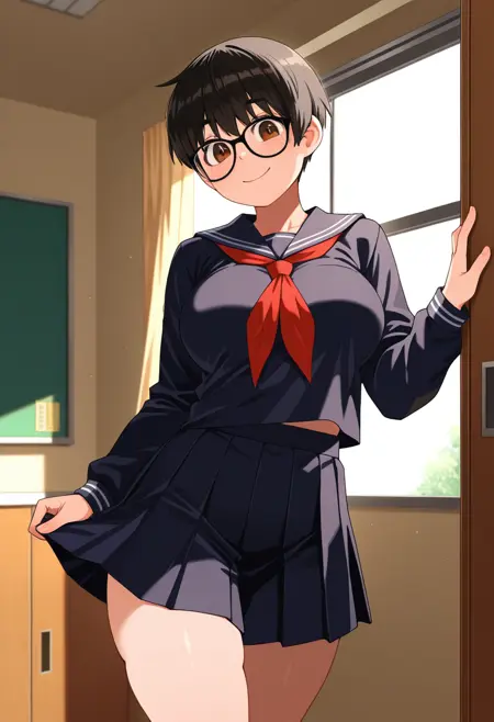 - kaedeww, jimiko, brown eyes, black hair, short hair, glasses, large breasts,