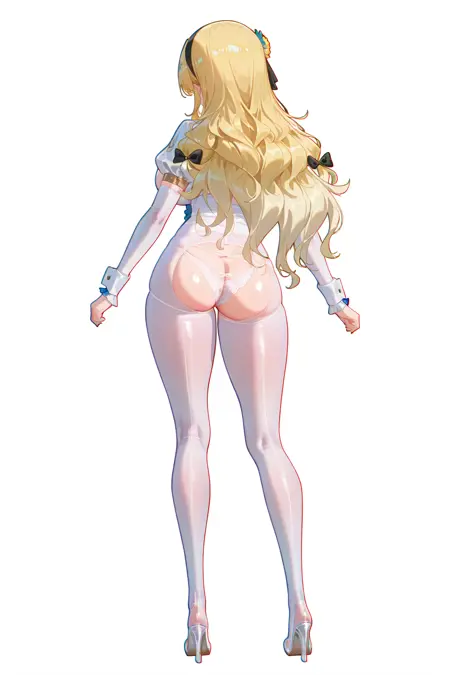 feibi,1girl,solo,long hair,large breasts,blue eyes,blonde hair,yellow flower,blue flower,white pantyhose,white lace-trimmed panties,white elbow gloves,wrist cuffs,see-through pelvic curtain,see-through high heels,tacet mark (wuthering waves),skindentation,puffy sleeves,long sleeves,hairband,hair ornament,hair bow,elbow gloves,earrings,crotchless pantyhose,breast curtains,black bow,areola slip,