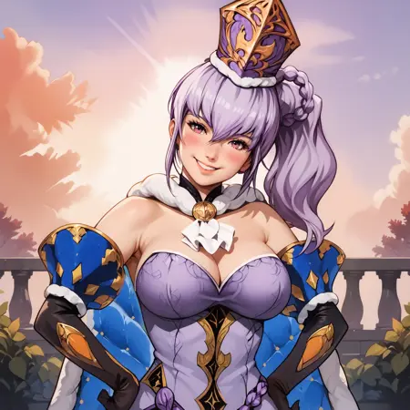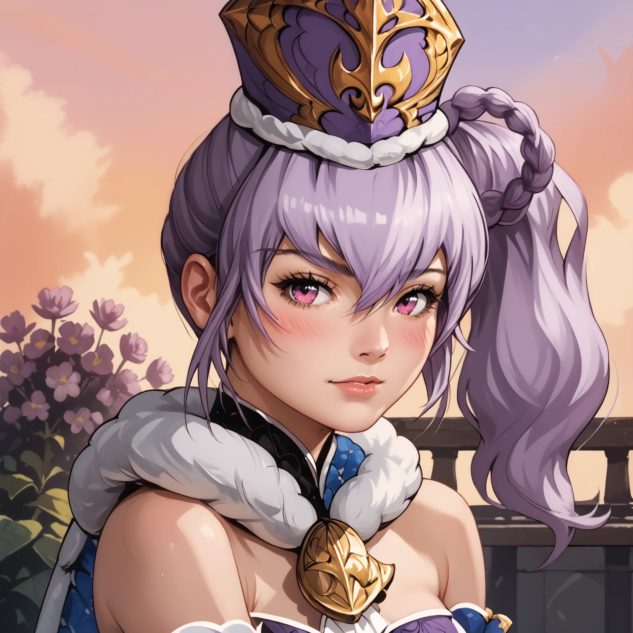 触发词: 奥克塔维亚,马尾辫,紫色头发,辫子,大胸,帽子,毛皮镶边斗篷,乳沟,肘套,连衣裙,连裤袜,
