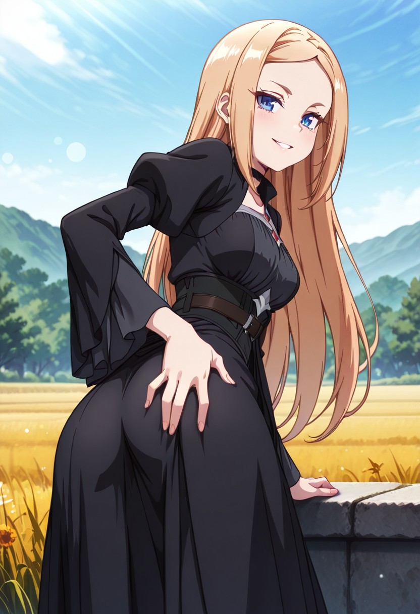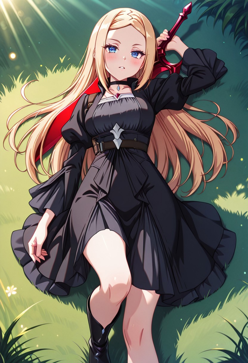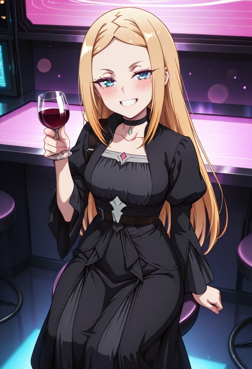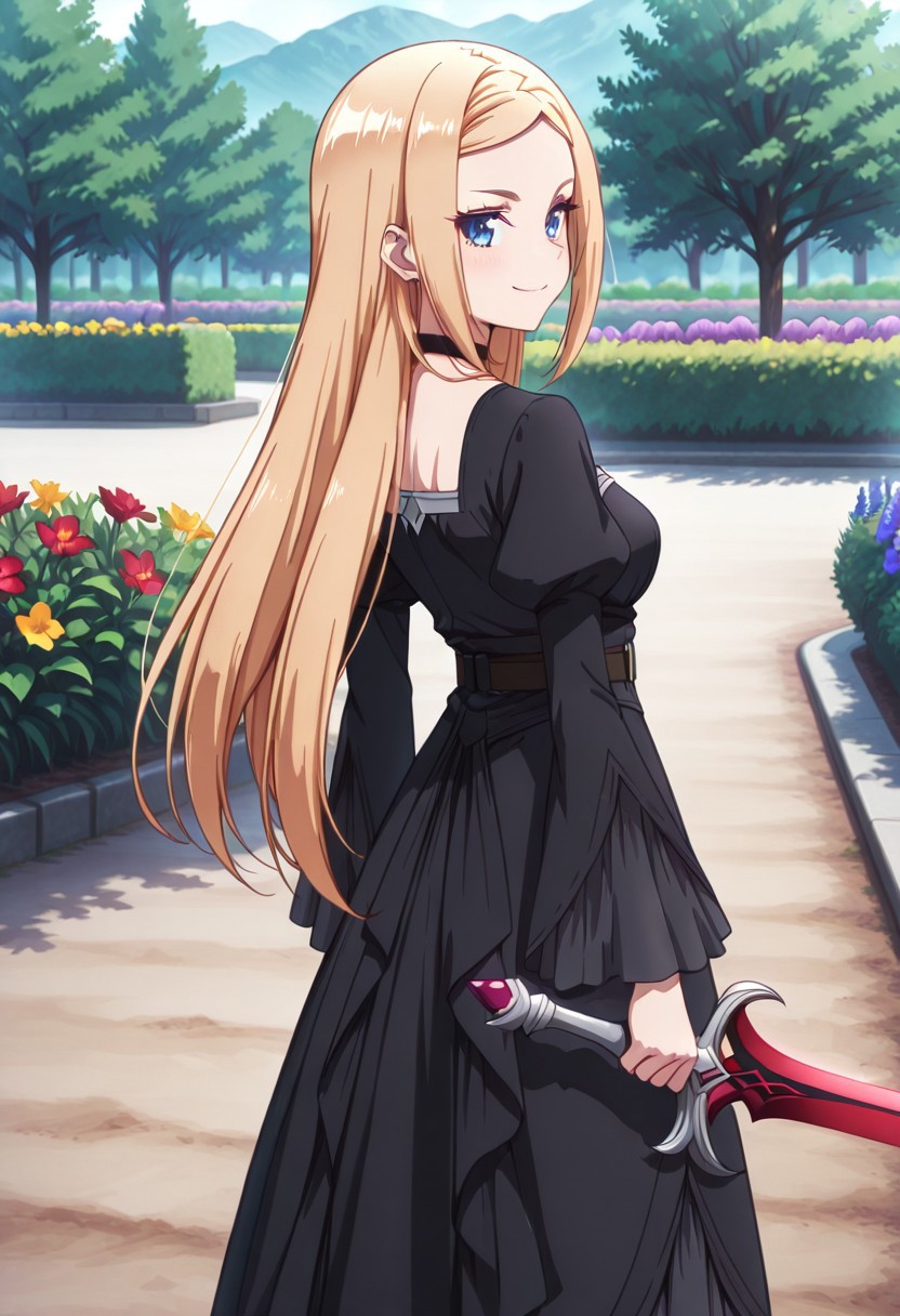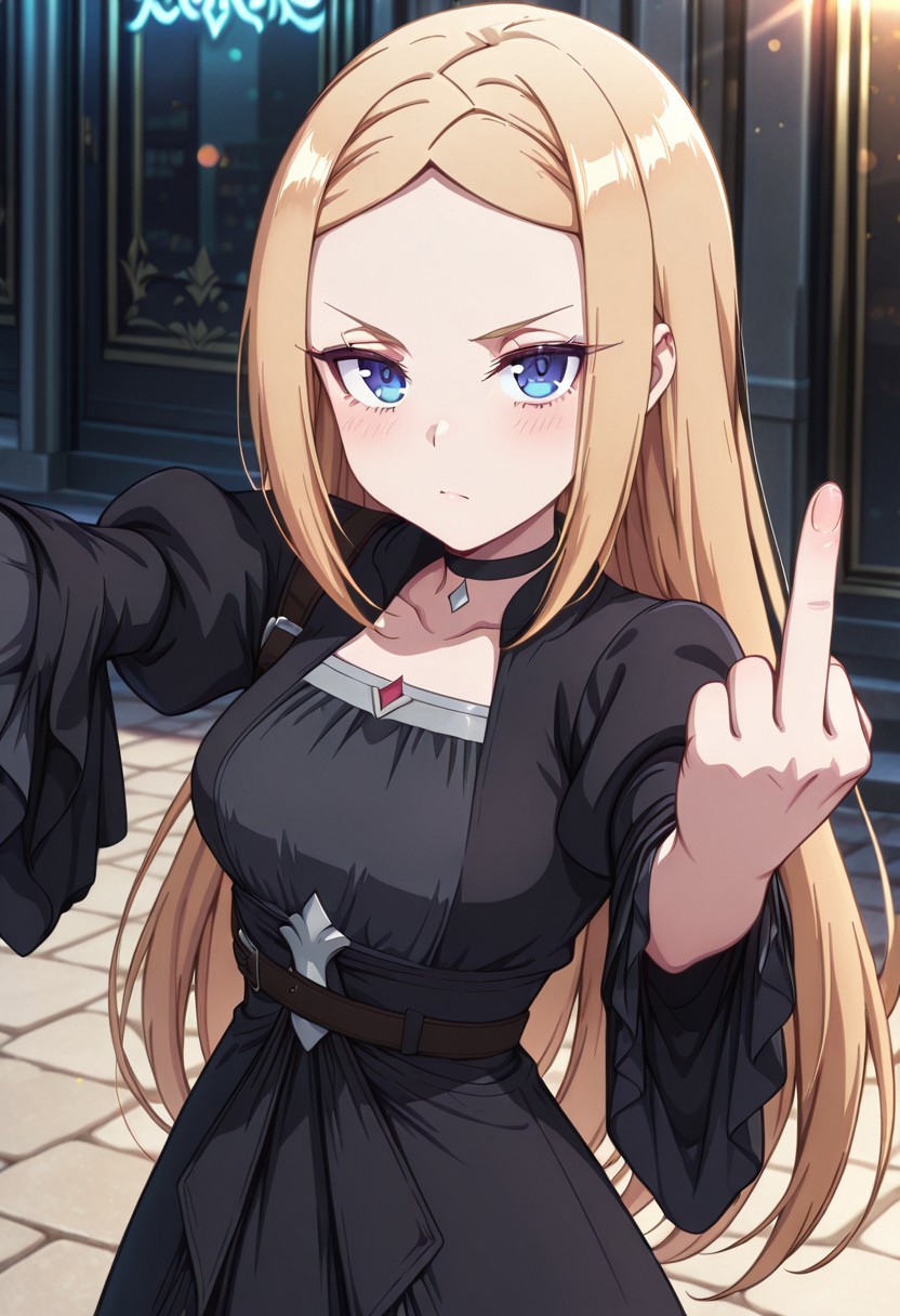 キャラクターの外見:金髪、長い髪、青い目、黒い首輪、サイドロックス、小さな胸