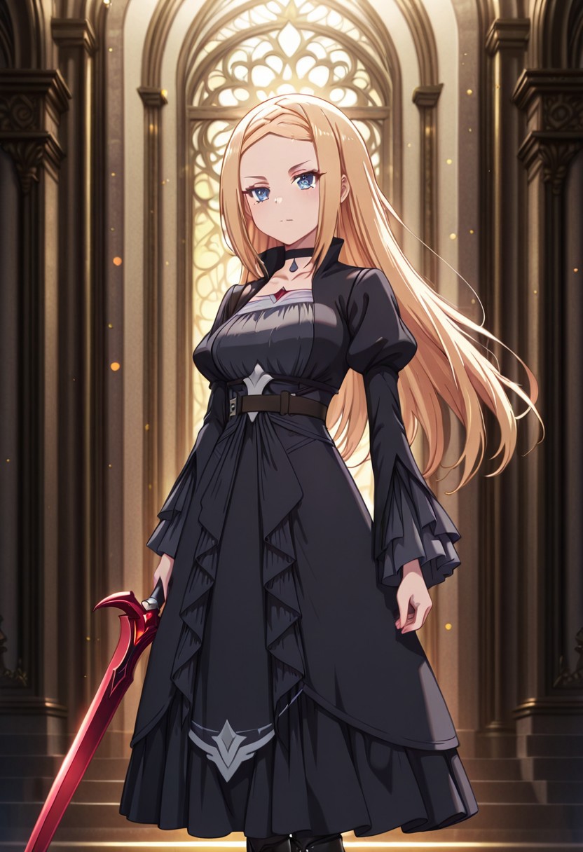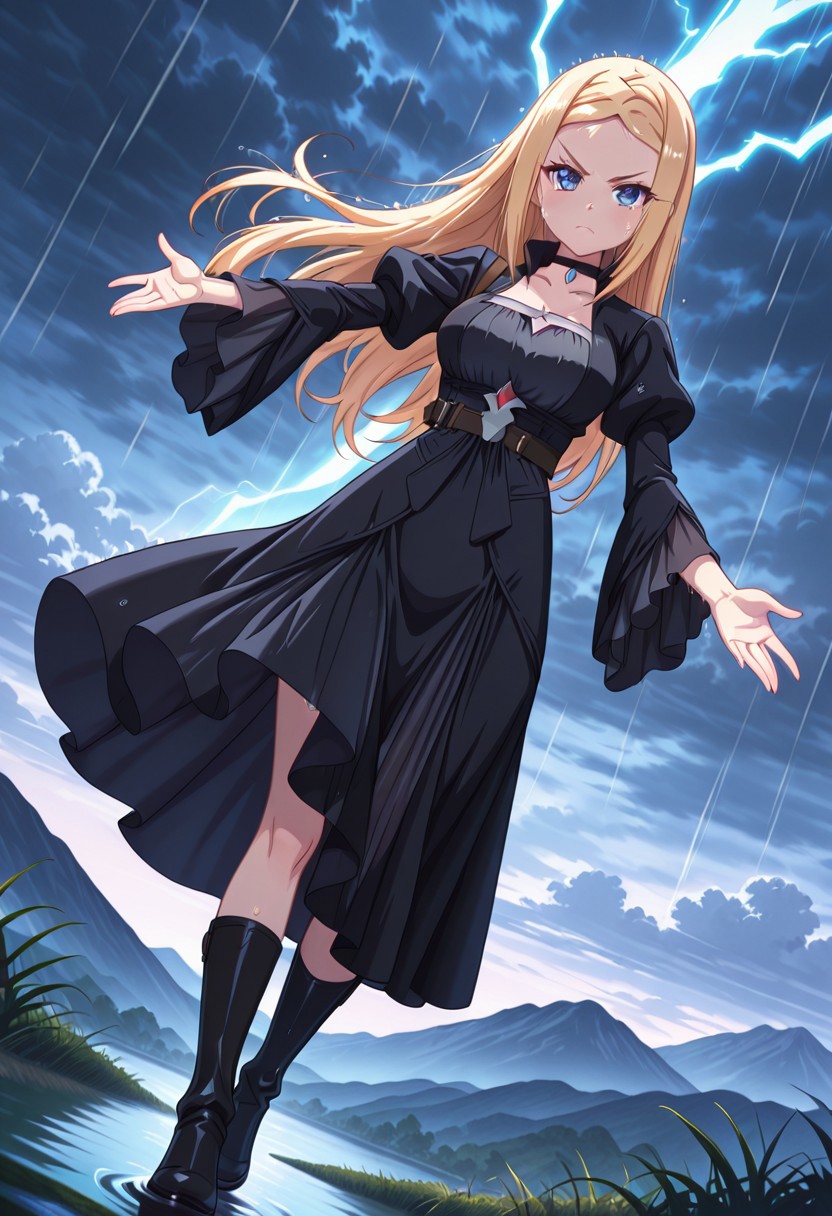 服装:ドレス、ゴシックドレス、黒いドレス、長袖、ベルト、黒いブーツ、ジュエリー