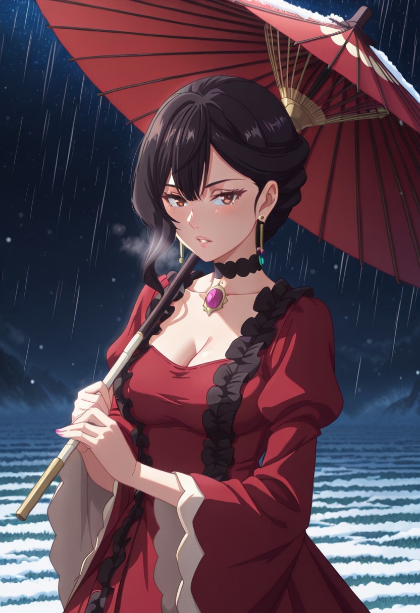 キャラクターの外見:黒髪、ロングヘア、サイドスイープ、前髪、茶色い目、イヤリング、レースのチョーカー、中程度の胸