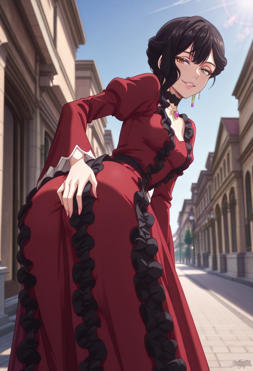 服装:ロングドレス、赤いドレス、黒いレース、ジュエリー