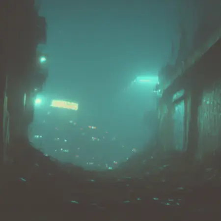 Expect cluttered environments filled with wires, glowing screens, and cybernetic implants — all rendered with cinematic lighting, film grain, and a graffiti-stained sense of realism.