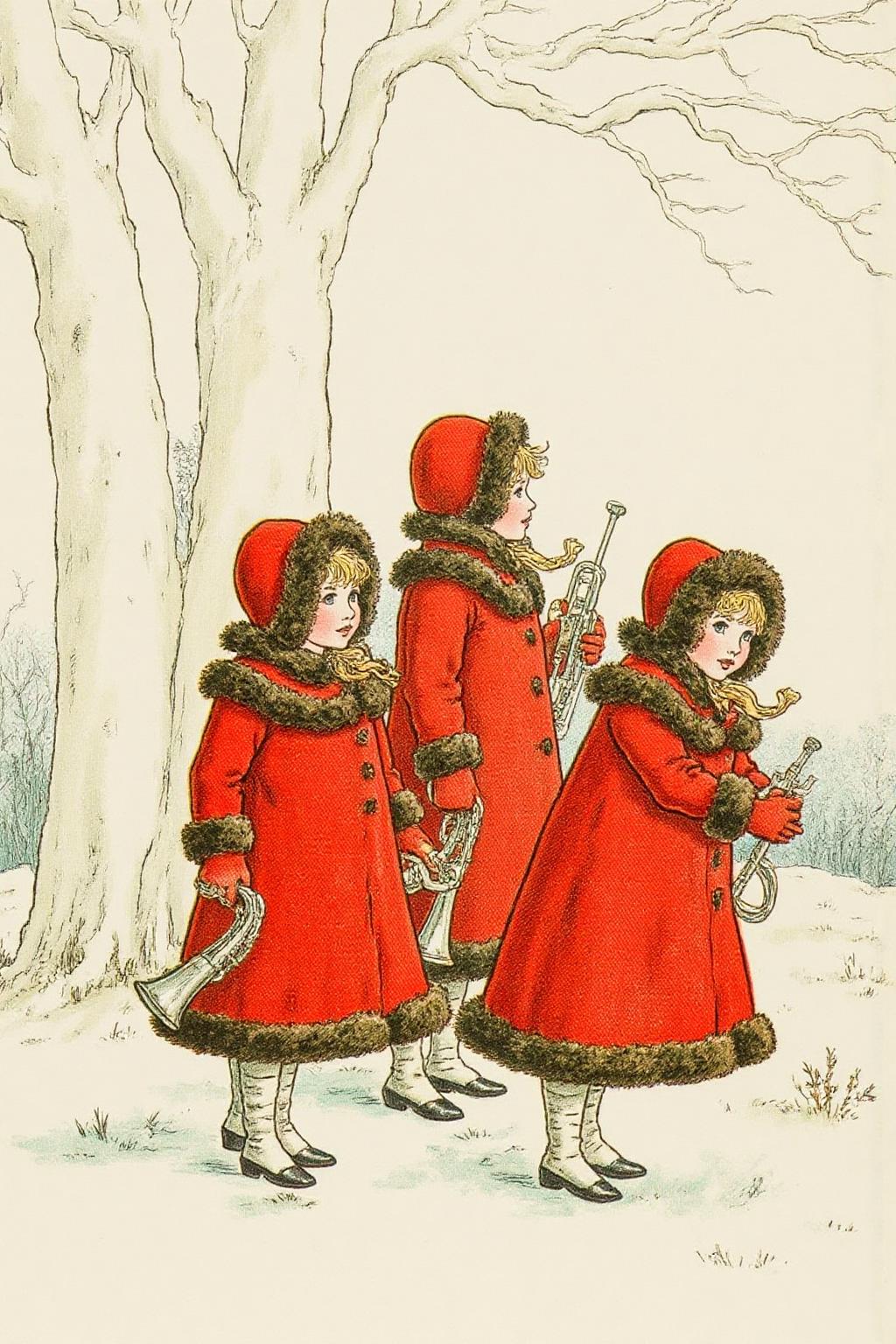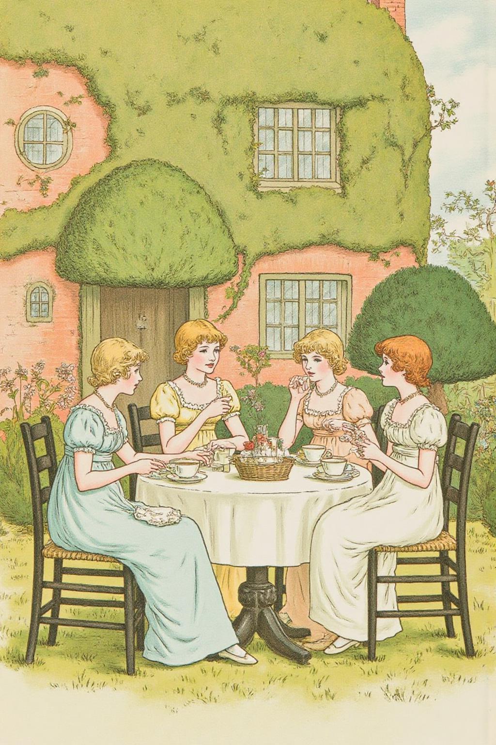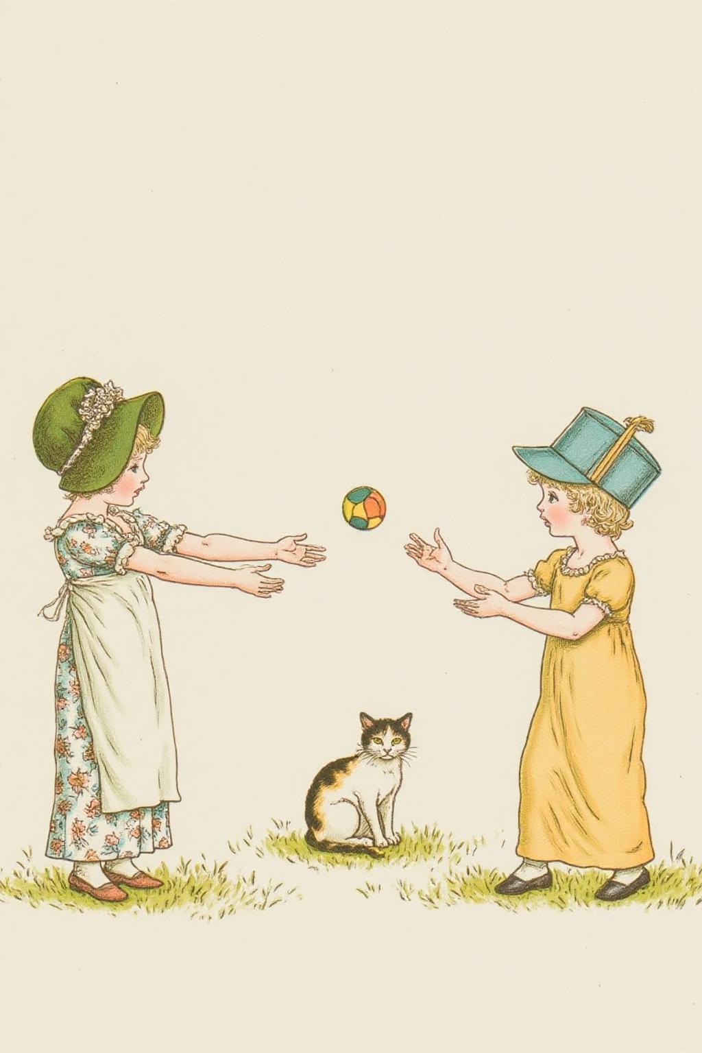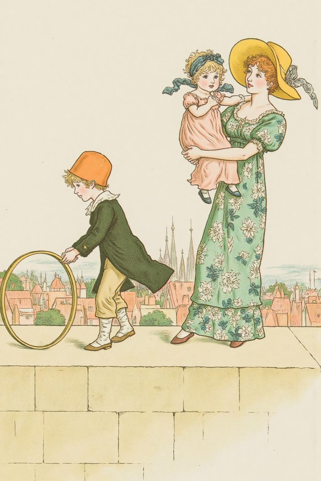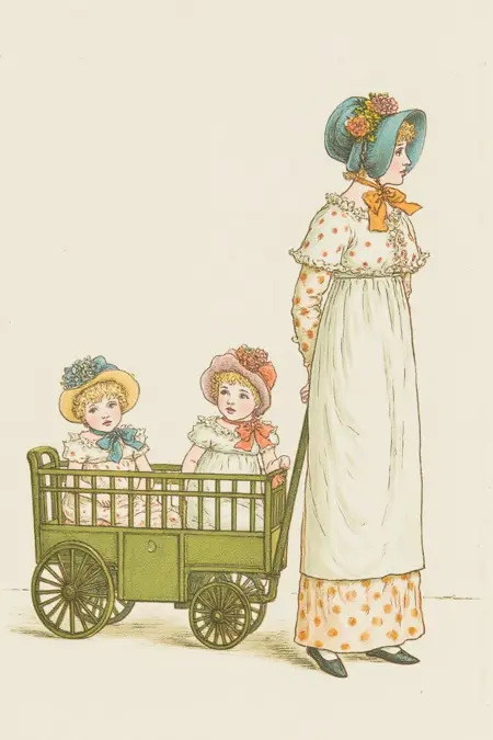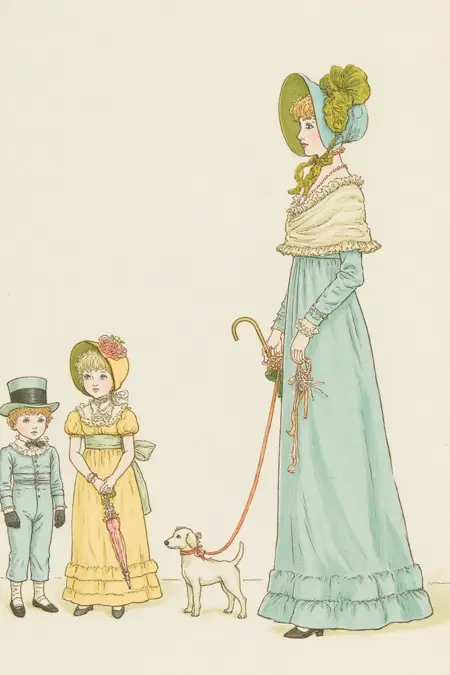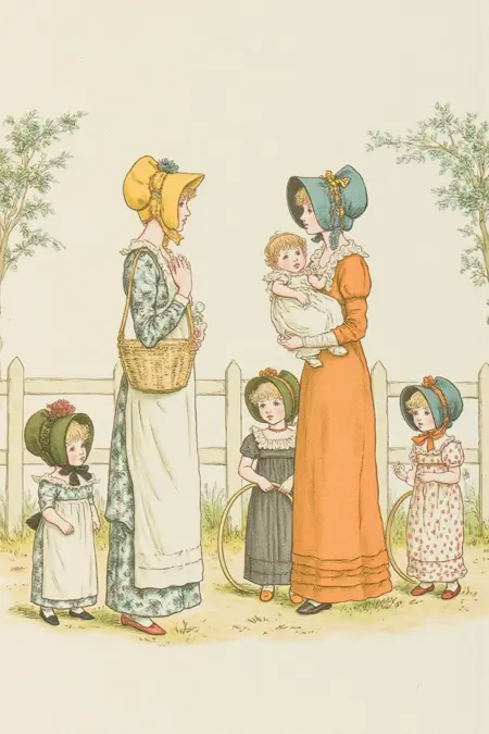 Depiction of children in 18th-century-inspired clothing, such as smocks, bonnets, and empire-waisted dresses—though not historically accurate, these outfits became known as “Greenaway dresses.”