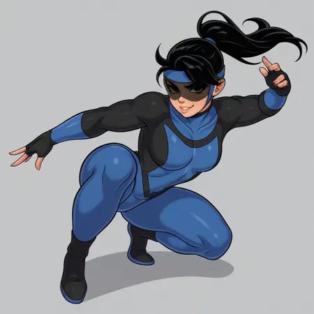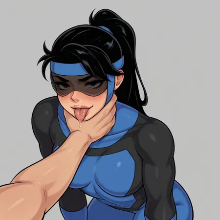 Femvincible, black hair, black eyes, ponytail, bodysuit, black visor,