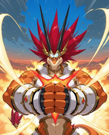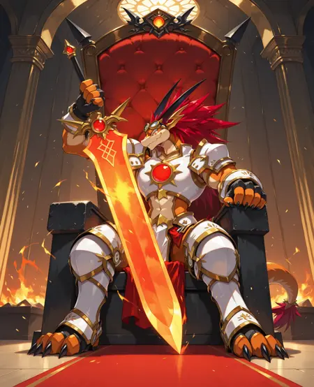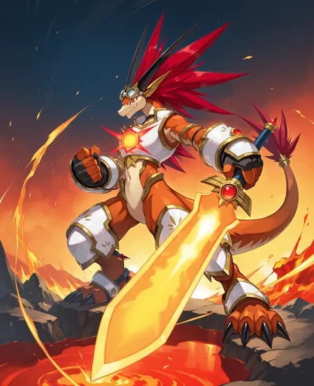 是一种人形火龙,身披炽热的红色鳞片,头顶尖刺般的火焰状头发,双眼闪烁着红光。他身着以太阳为灵感的铠甲,手持一把巨大的火焰之剑。性格精力充沛、声音洪亮且忠诚。