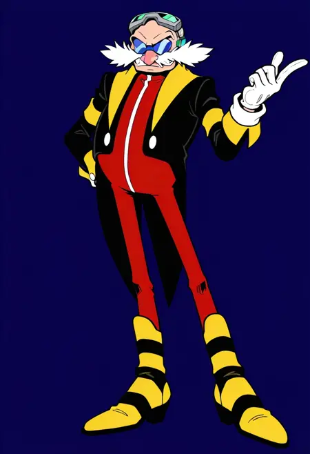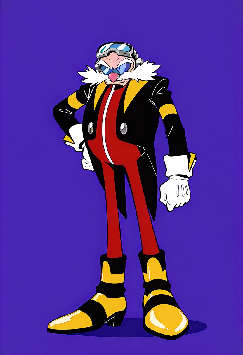 EggmanNega, 1boy, red suit with yellow accents, black jacket, white cuffs, distinctive white fluffy collar, long legs, yellow and black striped boots, round bald head, blue sunglasses, white pointed mustache, distinct pink nose, silver goggles,