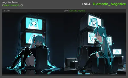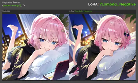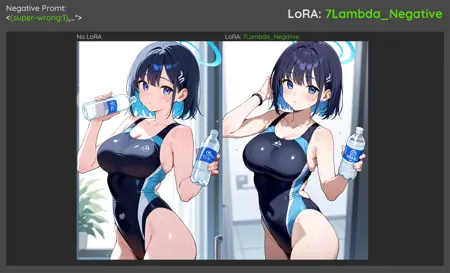 이 LoRA에서는 이미지 생성 과정에서 일반적으로 발생하는 가장 큰 문제들을 철저히 선정하고 종합했습니다. 정교한 데이터셋 커링과 학습을 거친 결과, 양성 LoRA를 사용하지 않아도 이미지 품질이 크게 향상되는 것을 확인했습니다!