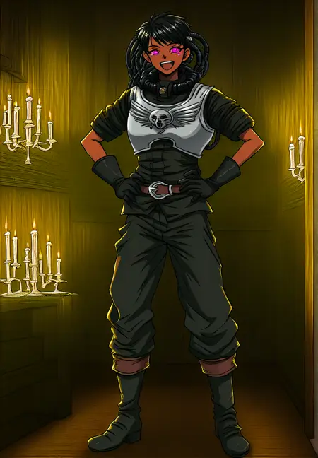 关于她游戏内的外观:"短发,黑色/棕色头发,电缆,深色皮肤女性,紫色眼睛,盔甲,胸甲,长裤,靴子"