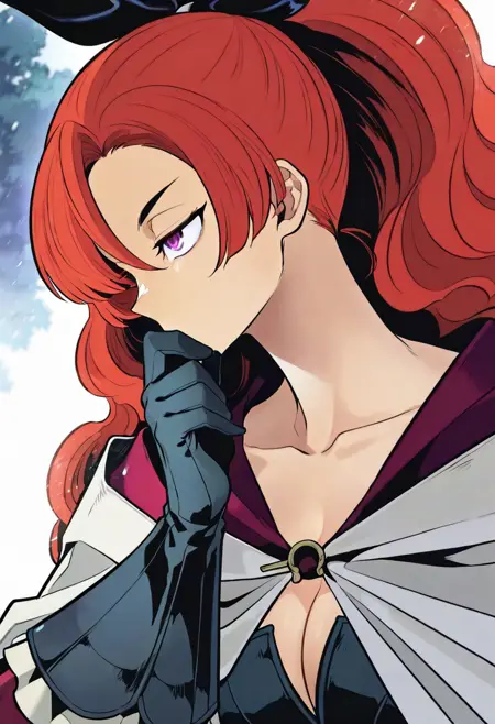 bamirade, 1girl, solo, purple eyes, red hair, very long hair, ponytail, wavy hair, hair bow, bangs,