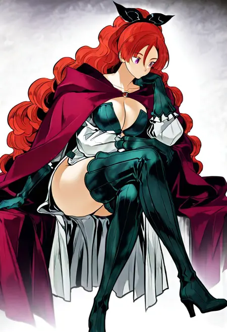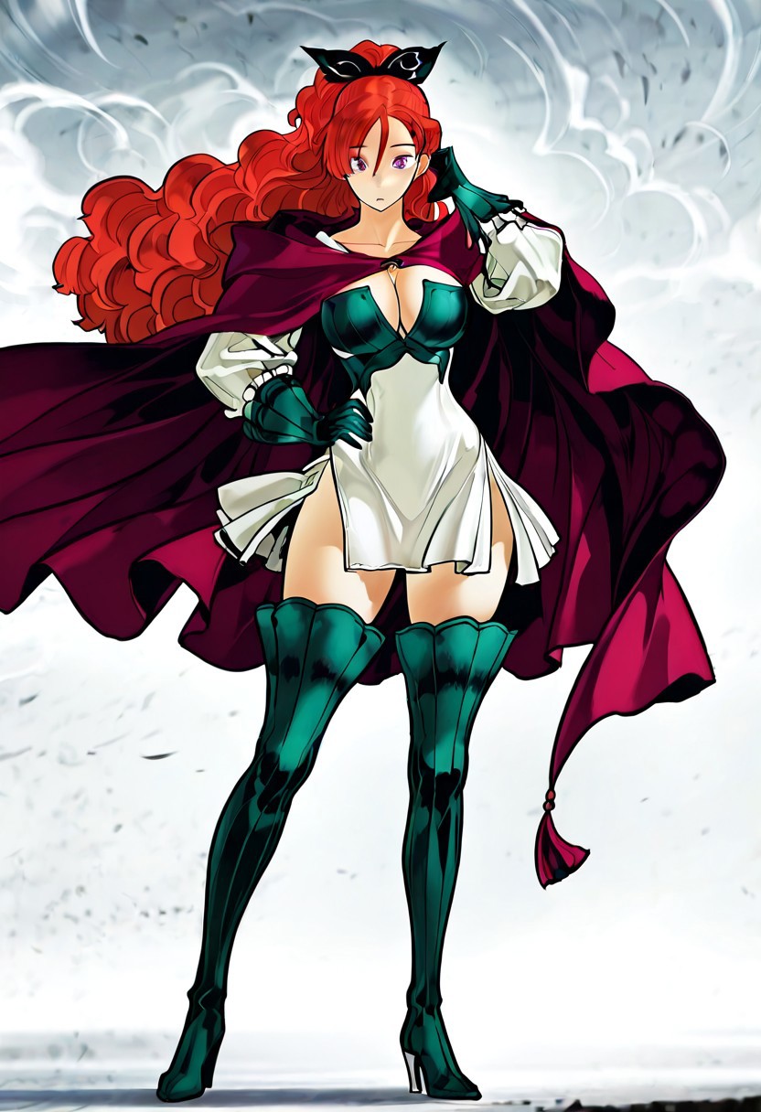 black gloves, cape, collarbone, cleavage, thighhighs, boots, dress, high heels, armor,