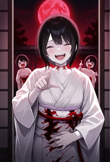 검은 머리카락, 목 자국, 짧은 머리, 검은 눈, 흰 키모노, 오비, 밧줄, 창백한 피부